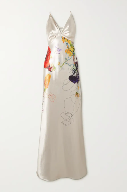 The gown by Jason Wu Collection is embellished with vibrant florals and ribbons that pop against the soft cream background. It's made of lustrous satin that flows over your body and falls to a floor-skimming hem, and it's part of the Resort '22 collection. Click here to get this cute piece to look the most adorable person in the gathering.